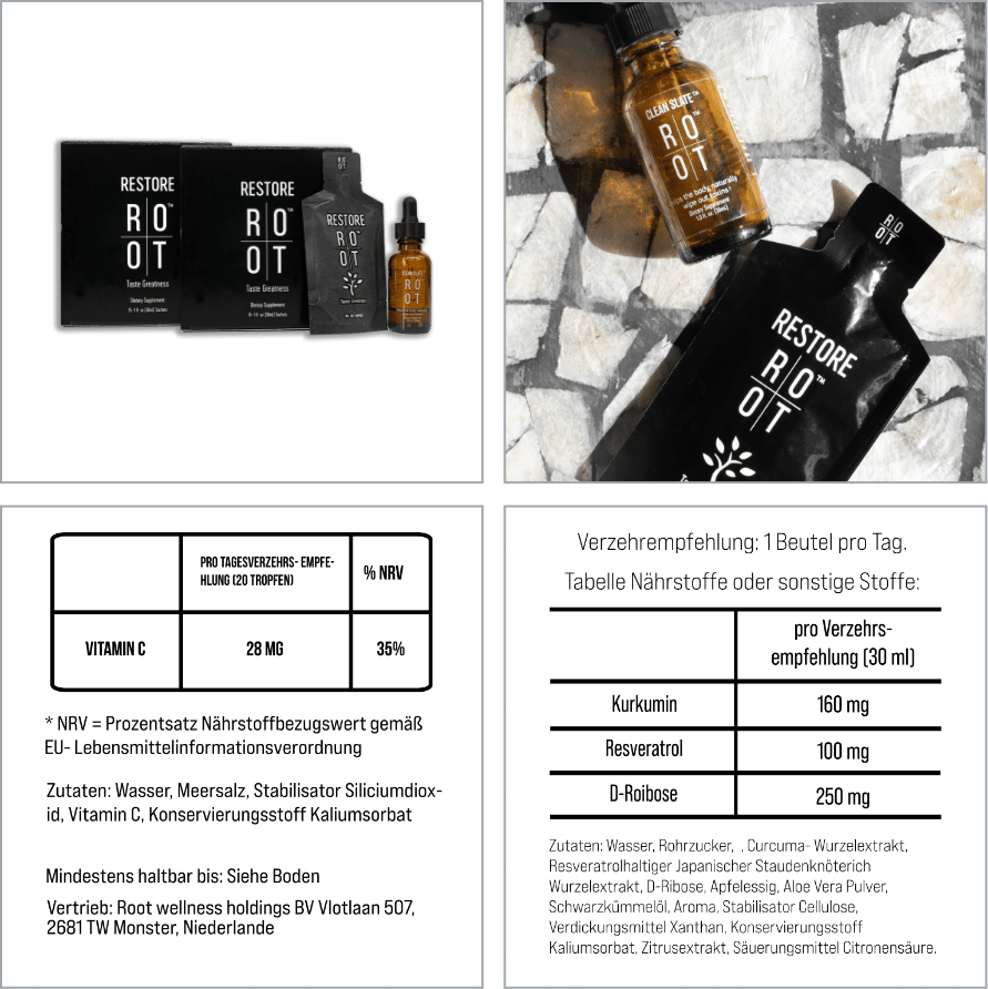 Restore wurde auf der Grundlage mehrerer in den USA zum Patent angemeldeter proprietärer Quanten-Nanoemulsions-Technologien entwickelt. ROOT hat dabei kraftvolle Inhaltsstoffe aus der Natur gewählt und wertvolles Know How der Biowissenschaft und der Biotechnologie genutzt. Restore bietet all jenen, die ihren Körper mit wertvollen Vitaminen, Mineralien, Aminosäuren und Nährstoffen versorgen wollen, eine großartige Unterstützung.